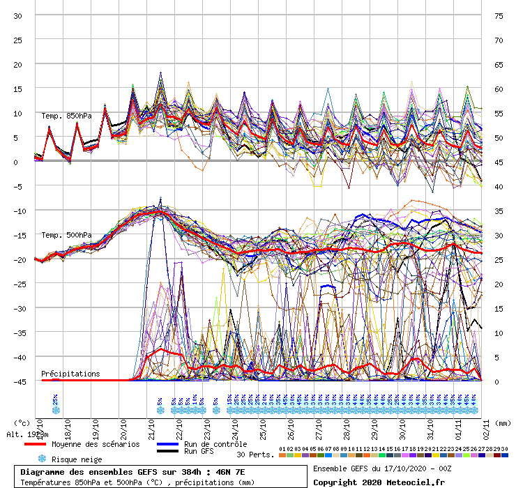 This chart shows the 14 day weather trend for Crans-Montana (Valais, Switzerland) with daily weather symbols, minimum and maximum temperatures, precipitation amount and probability. The deviance is coloured within the temperature graph. The stronger the ups and downs, the more uncertain the forecast will be. The thick line represents the most.
