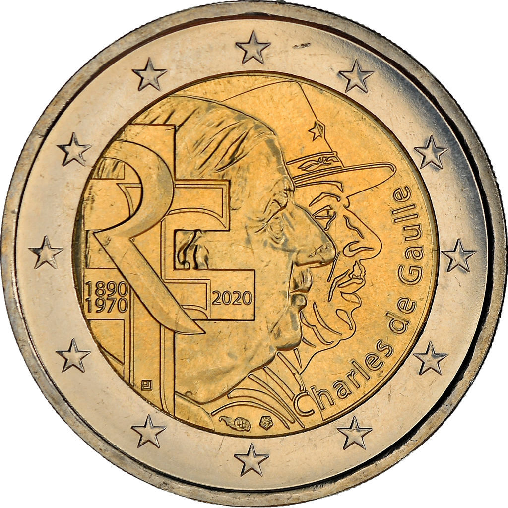2 Euro France 2020 - Charles de Gaulles. Nouveau produit. 4,89 €. Livraison Prévue entre le 7 et le 12 Févier 2020. - +. Commander. Ajouter à ma liste de cadeaux. En savoir plus. Pièce de 2 Euro commémorative France 2020 50e anniversaire de la disparition du général Charles de Gaulle (1890-1970).