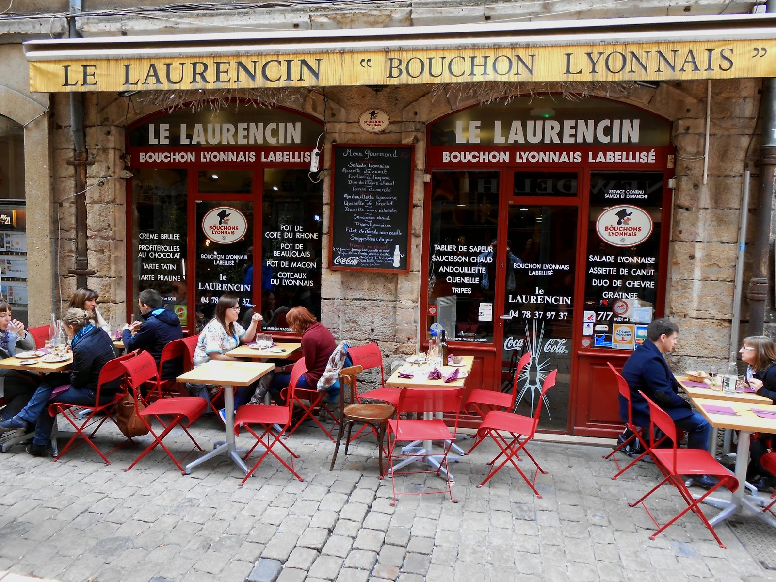 De bons petits plats typiques, simples, à base de produits frais, du terroir, préparés sur place avec amour : quenelles, cochonnaille, tablier de sapeur, gâteau de foie de volaille, cervelle de canuts, tarte à la praline…. 4. Le tout accompagné de l'indispensable pot lyonnais (Beaujolais ou Côtes du Rhône bien sûr). Et surtout.