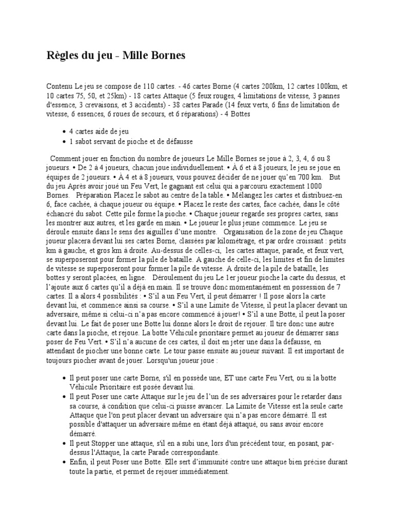 Règle Mille Bornes officielles extraite de la version 2014 éditée par Dujardin.Nombre de joueurs : 2 à 4 (ou 4 à 8 en équipes de 2)Contenu du jeu : 110 cartes réparties comme suit : But du jeu : Être le premier joueur à atteindre 1000 Bornes ! Sommaire : I - Préparation du jeu. Continuer la lecture de Règle du mille Bornes