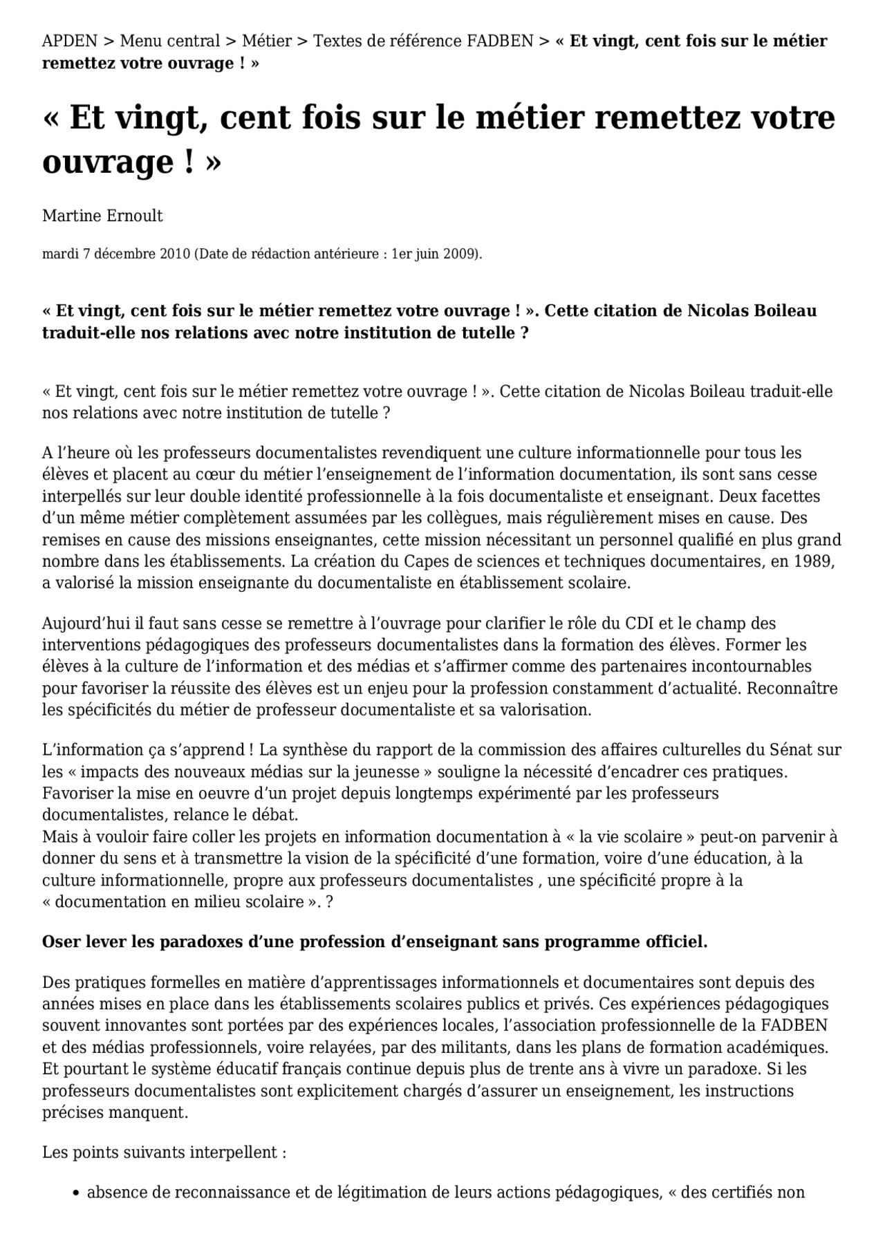 Et vingt, cent fois sur le métier remettez votre ouvrage! Lectures Méthode de l'enseignement